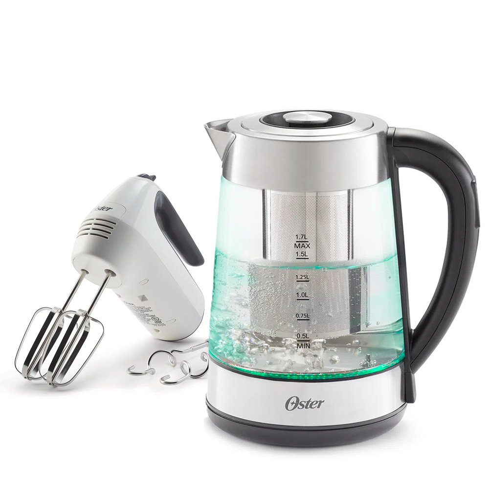 Este combo Oster incluye la Batidora de Mano FPSTH3532 Blanco de 250 watts, que cuenta con 6 velocidades, función Turbo, y un botón multifuncional para facilitar el uso y la expulsión de los batidores o ganchos amasadores, lo que la convierte en una herramienta ideal para mezclar desde masas gruesas hasta delicados merengues. Además, su diseño ergonómico y potente motor aseguran comodidad y eficiencia. El Hervidor Eléctrico de Vidrio con Infusor Oster BVSTKT8990, por su parte, ofrece una capacidad de 1.7L, control de temperatura ajustable entre 50° y 100°C, y una base iluminada que indica cuando el agua hierve. Su infusor de acero inoxidable, filtro removible, sistema de auto-apagado y protección contra secado garantizan seguridad y facilidad de uso. Con base antideslizante y almacenamiento de cable, este combo es perfecto para preparar una variedad de recetas con eficiencia, comodidad y seguridad en la cocina.
