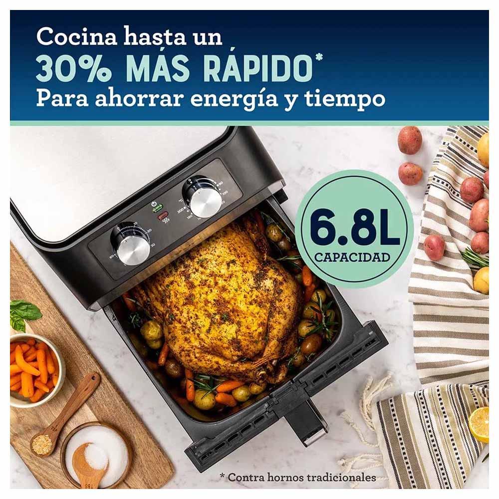 Sigue disfrutando de tus platillos preferidos de una manera saludable con la nueva freidora de aire Oster con capacidad de 6,8L.Esta innovadora freidora tiene revestimiento antiadherente DiamondForce infundido con partículas de diamante que la hace 12 veces más duradero y resistente a rayaduras y hasta 15 veces más fácil de limpiar.