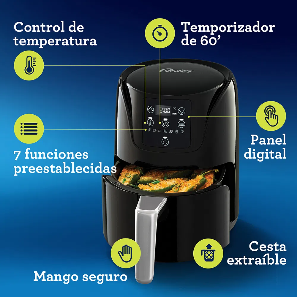 La freidora de aire Oster digital con capacidad compacto de 1,8L incluye una bandeja de freír con aire extraíble con revestimiento antiadherente DiamondForce para más espacio y una fácil limpieza.