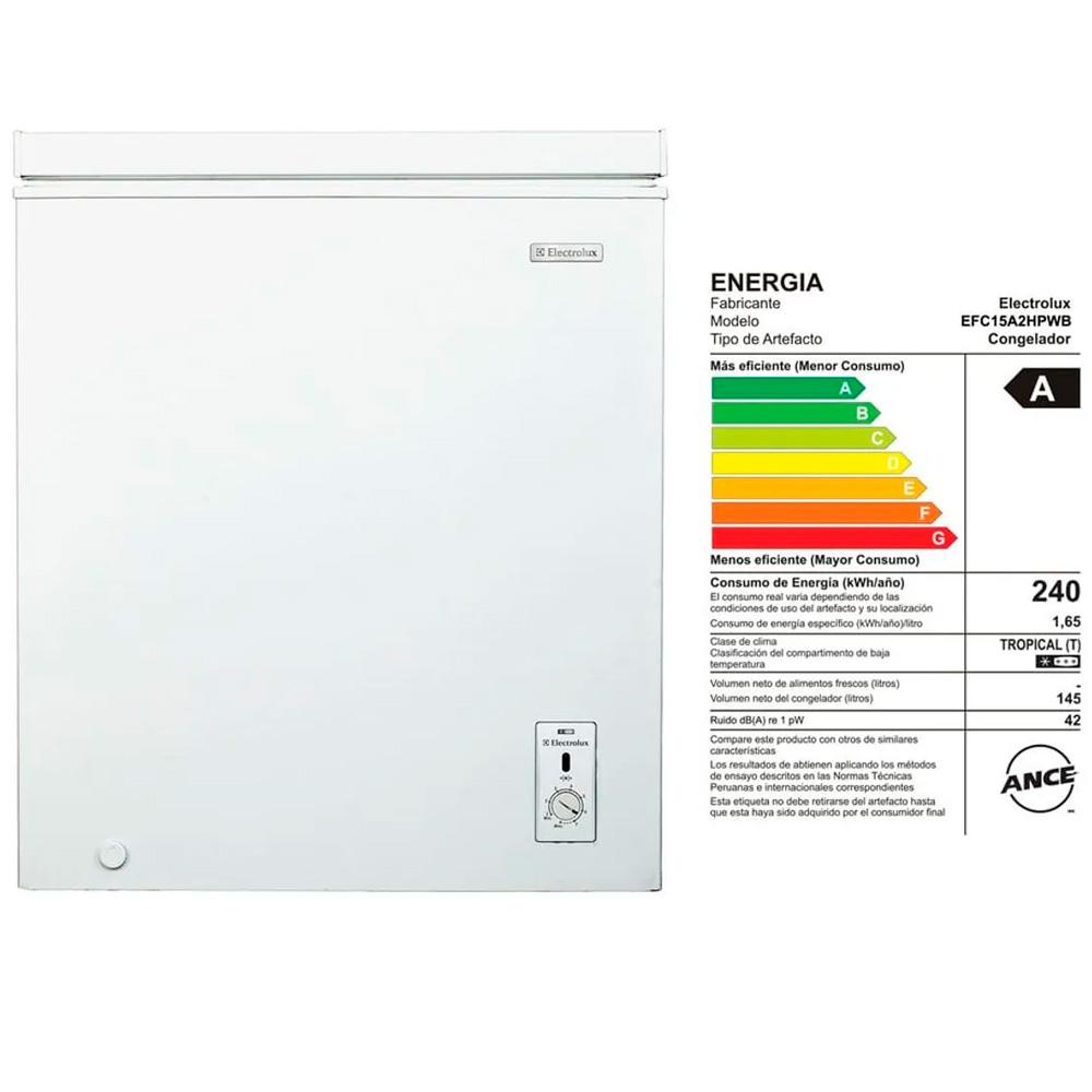 El congelador horizontal EFC15A2HPWB tiene una capacidad de 145 litros, es de una sola puerta y funciona con control de temperatura mecánico. Brinda el máximo poder de congelamiento, ya que está clasificado con 4 estrellas, es decir, que congela hasta -24 °C, lo que garantiza que los alimentos se conserven por más tiempo. Para organizar los alimentos, dispone de una canastilla, en donde se pueden guardar pequeños artículos o los que sean de uso más frecuente, porque permite fácil acceso.