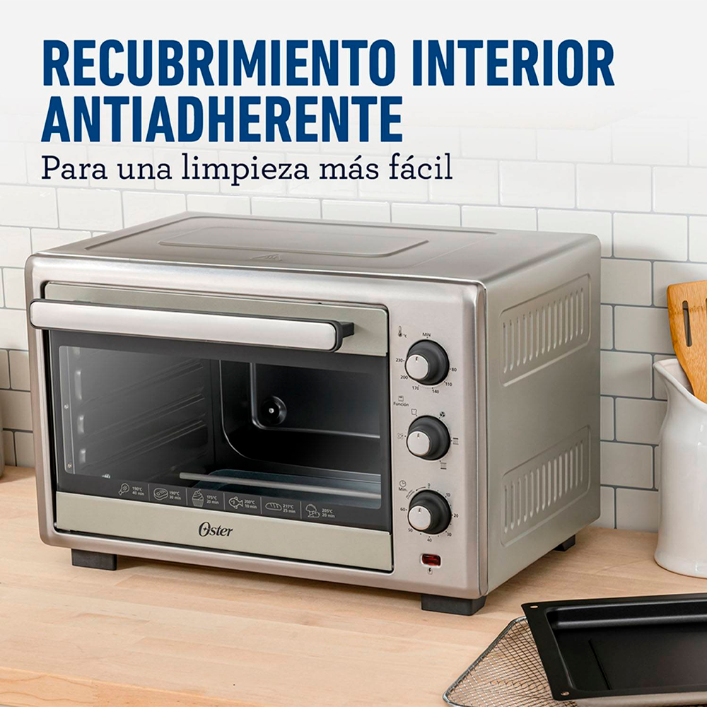 Con el nuevo Horno Freidora de Oster TSSTTVLS35 podrás freír con aire y obtener resultados perfectamente crujientes y gracias a su gran capacidad de 35 litros es ideal para cocinar porciones grandes de comidas. Cuenta con 5 funciones pre programadas: Freír con aire, hornear/tostar, asar, convección y mantener caliente. Su recubrimiento interior Antiadherente facilitará su limpieza y su acabado de acero inoxidable hará que combine en cualquier espacio de tu cocina.