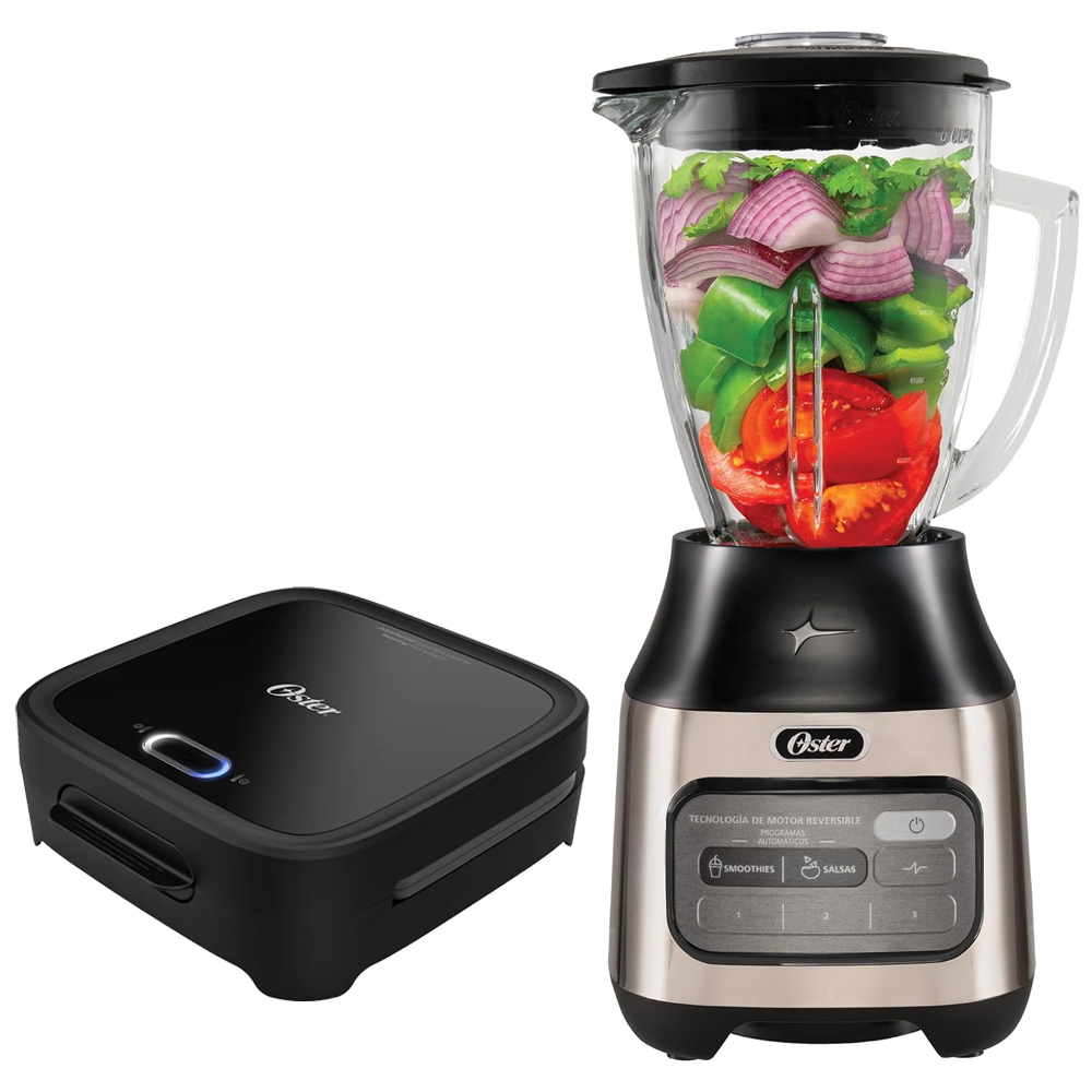¡Transforma tu cocina con el Combo Oster! La Licuadora BLSTPEG-NRT cuenta con un vaso de vidrio Boroclass, cuchilla de acero quirúrgico y un potente motor de 800 W. Con 3 velocidades, pulso y tecnología reversible, es perfecta para preparar tus batidos y mezclas. La Sandwichera Oster CKSTSM400 es compacta y versátil, ideal para sándwiches más gruesos, tortillas y crepes. Su diseño estable con soportes de goma y el mecanismo Quick Lock aseguran facilidad y seguridad.
