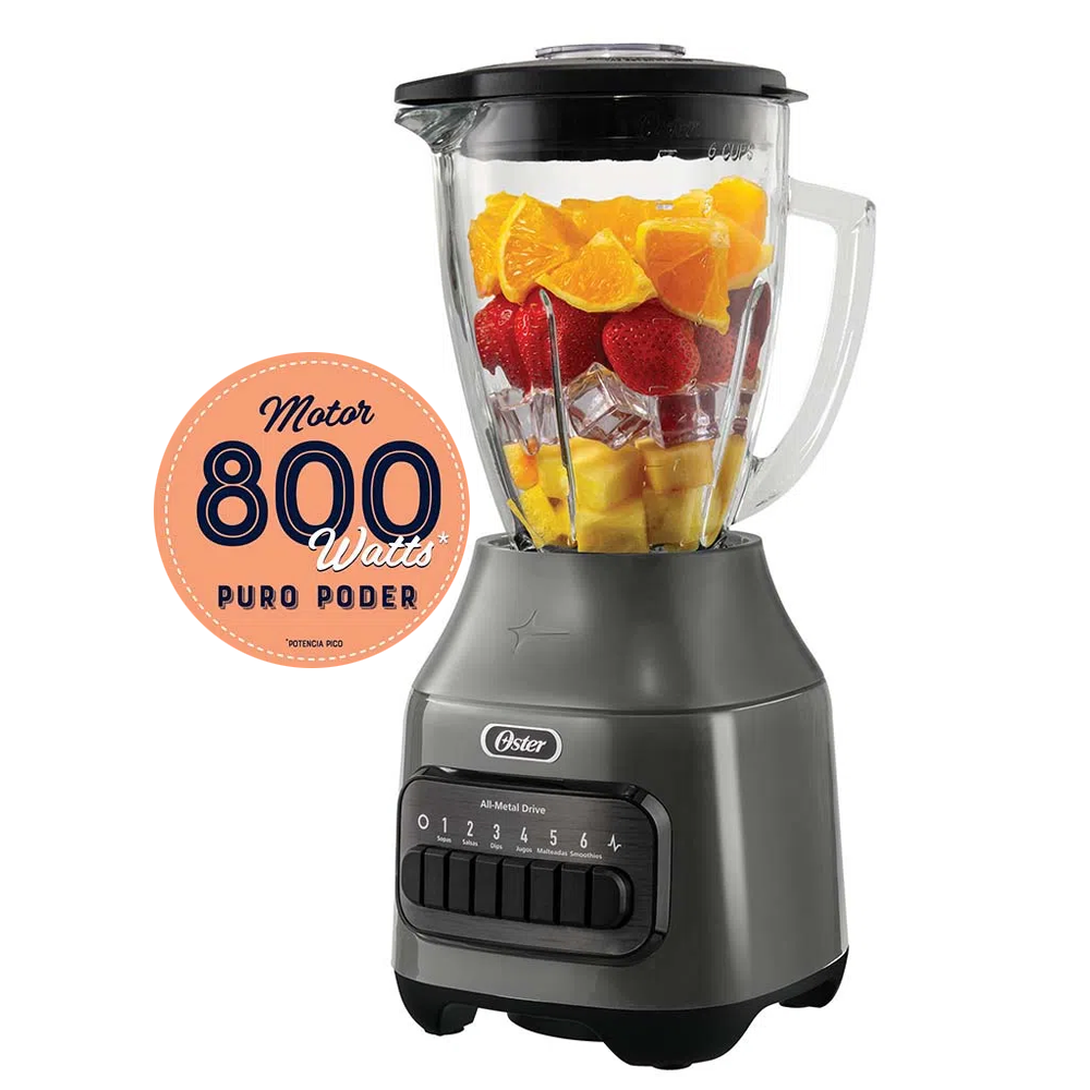 Licuadora Oster modelo BLSTPEG-GPB, es perfecta para la preparación de una infinidad de recetas, jugos, batidos y mucho más, cuenta con un poderoso motor de 800 Watts, 6 velocidades mas un pulso el cual le da el toque final a todas tus preparaciones, vaso de vidrio super resistente de vidrio boroclass en el cual puedes verter ingredientes hirviendo, Vaso de vidrio refractario de 1,5 lts; Acople totalmente metálico, Cuchillas trituradoras de hielo