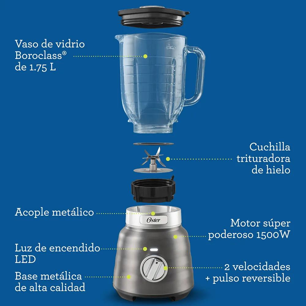 Inspirada en nuestra clásica licuadora Oster®, nace la nueva licuadora Osterizer Max Reversible que es más duradera y poderosa*, tiene un motor con 1500 W de potencia** con dos velocidades más pulso reversible que le permite girar las cuchillas en ambas direcciones procesando completamente todos los ingredientes. Su acople 100% metálico 10 veces más fuerte*** y acabado metálico de alta calidad en la base es más elegante para un consumidor exigente como tú, también posee una luz de encendido LED. El vaso de vidrio resistente a ingredientes hirviendo**** tiene 1,75 litros de capacidad y una revolucionaria cuchilla trituradora de hielo más grande que las regulares*****. Es una licuadora que te permite preparar día a día los más ricos platos, jugos y licuados con ingredientes duros o difíciles de mezclar. En ella puedes mezclar desde sopas y batidos, hasta jugos, muffins, salsas, sazonadores, tortas y muchas otras recetas. Lo que te provoque, lo puedes hacer de manera sencilla, fácil y agradable, obteniendo resultados profesionales. Es la licuadora que te da el poder para crear todo lo que imaginas y luego la podrás limpiar fácilmente gracias a que todas sus piezas son desmontables.